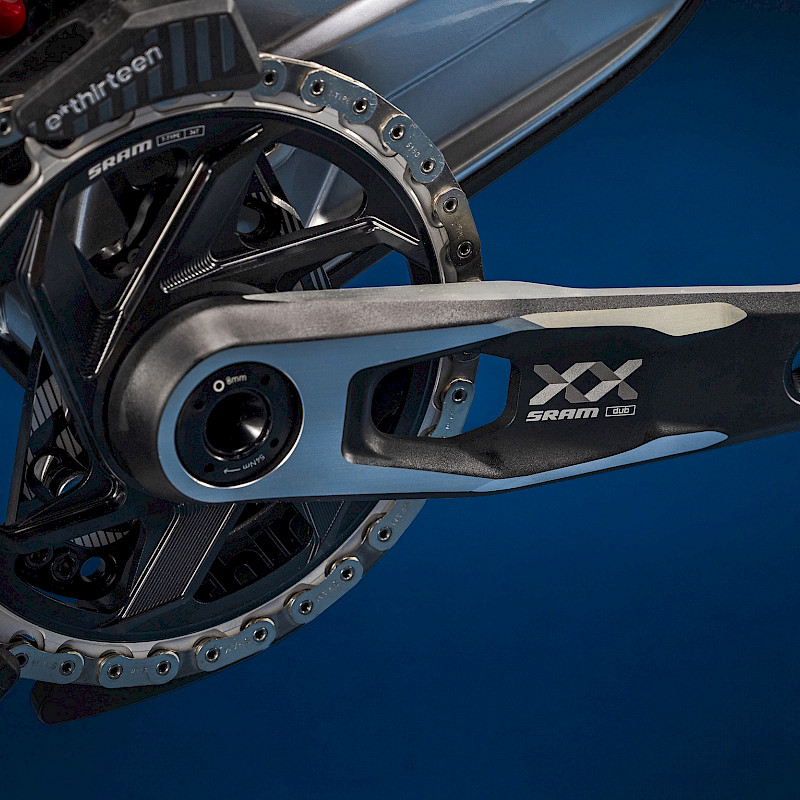 Neu gestaltete Gummi-Protektoren an Kettenstrebe, Unterrohr und Tretlager reduzieren die Geräuschentwicklung und schützen den Rahmen vor Stößen und Schmutzpartikeln. Der zusätzliche Unterrohrschutz verhindert Schäden durch den Sessellift oder beim Einladen in den Van.